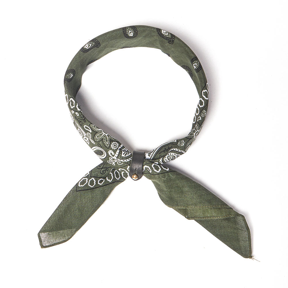 Comes with your choice of a black or natural color leather slide, a lavender, pink or olive bandana, and features solid brass button stud hardware.